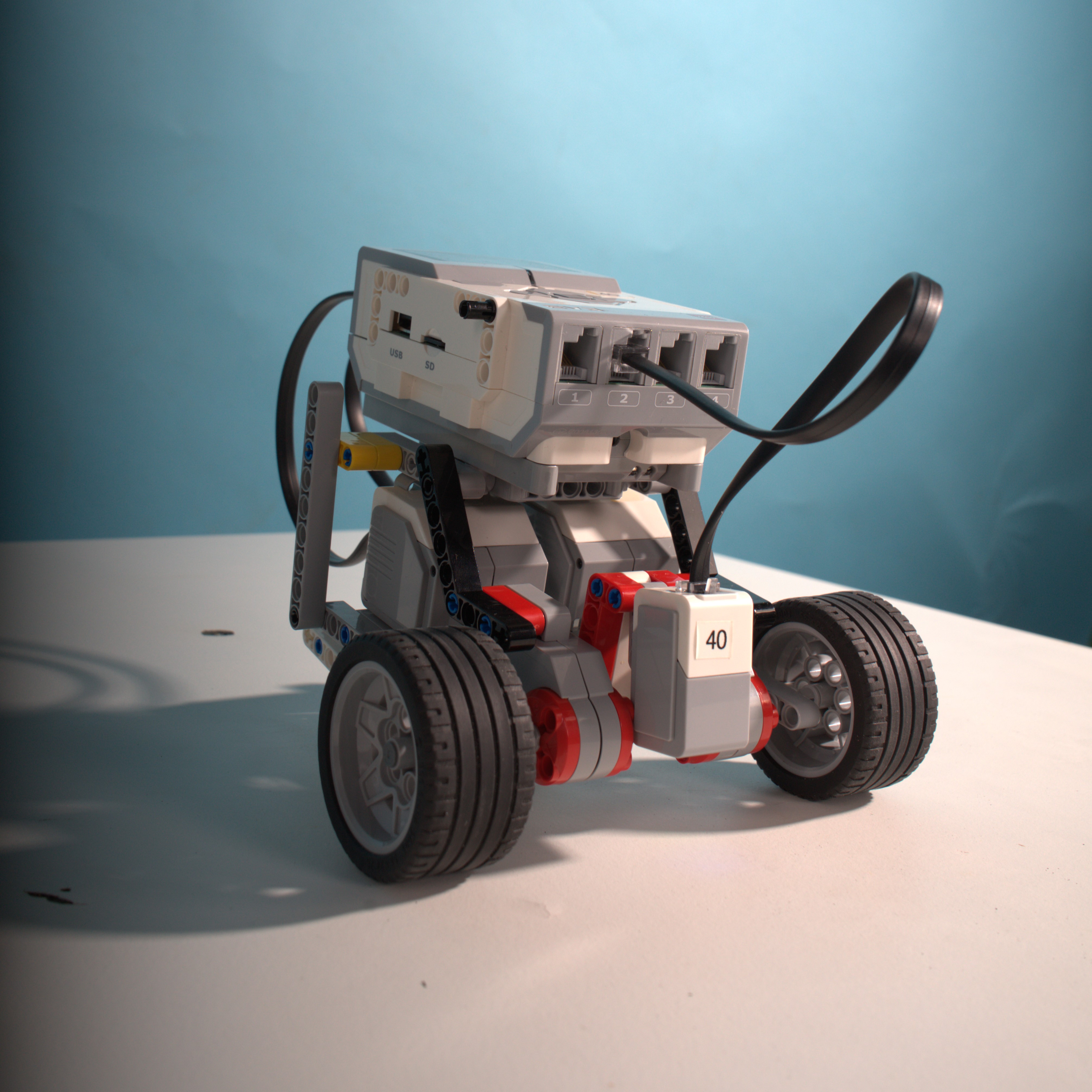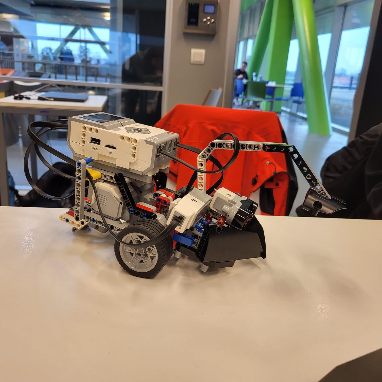 Onze eerste versie van de robot, deze kon alleen nog niet heel goed opstakels aan de kant duwen en een knop in drukken dus zijn we hierop verder gegaan.